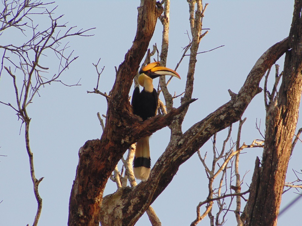 was driving the car in the early morning, it was so chill and thrilling. We halted near a deep wood, and started walking towards a thick jungle. Suddenly, I spotted a Wild Gaur and raised alarm. Our Forest Guard asked us to keep silent, until it moves from that place. In an unknown location we waited more than half-an-hour hiding in the bushes without moving an to get a glimpse of our Hero – The Great Indian Hornbill. Suddenly We heard some shuttering wings with the huge beak and feathers flying above our head,there it was The Great Indian Hornbill.